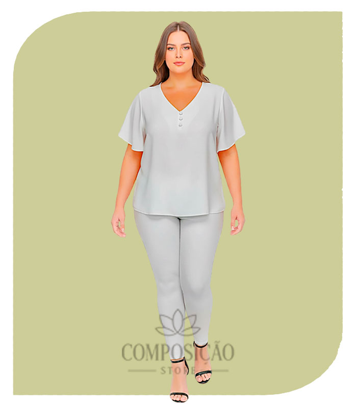 Decote: Decote redondo com detalhe em V e um recorte sutil, adornado por dois botões dourados que adicionam um ponto de luz e requinte à peça.