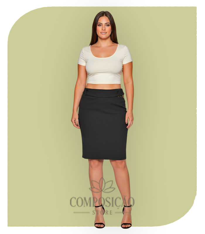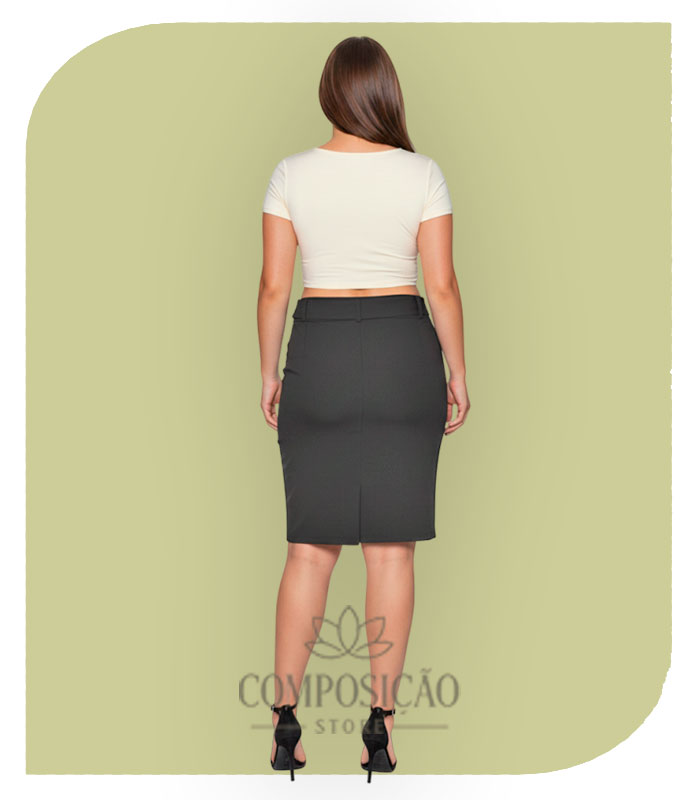 Modelagem: Lápis (Pencil Skirt), justa ao corpo do quadril ao joelho, criando uma silhueta elegante e alongada.