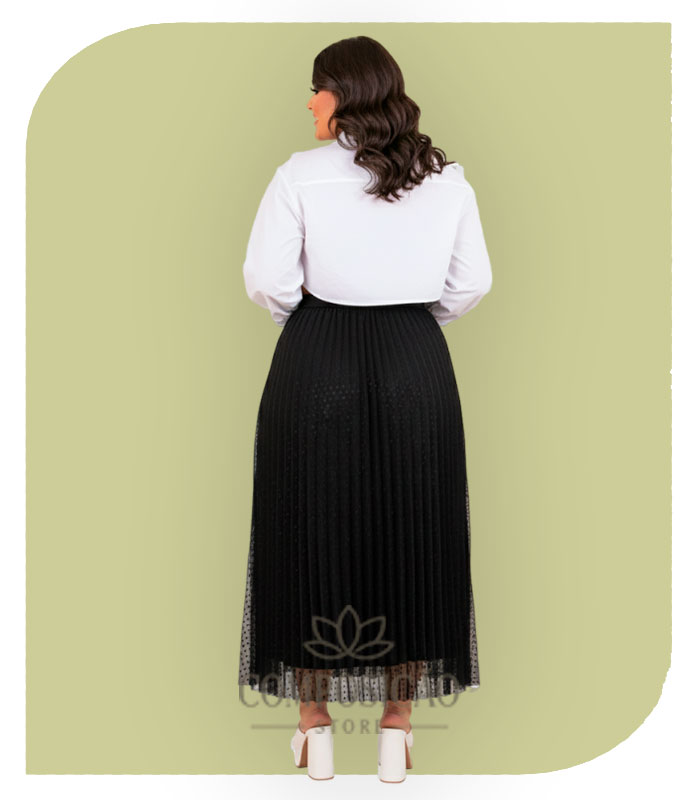 A Saia Midi Tule Poá é aquela peça que transforma qualquer look sem esforço. Confeccionada em tule leve e fluido, ela possui dupla camada: