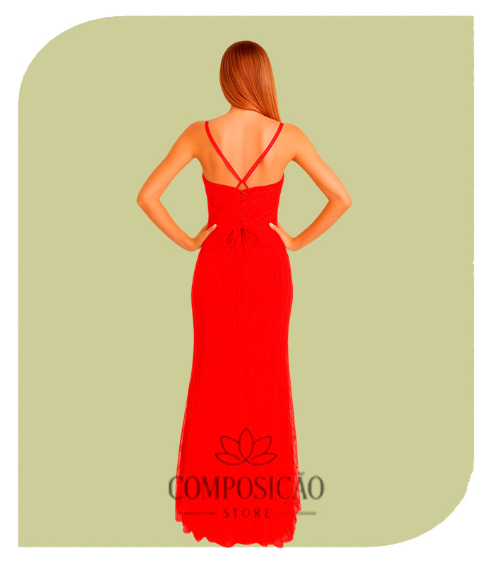 Vestido de Festa em Tule Bordado e Renda – Vermelho Rubi