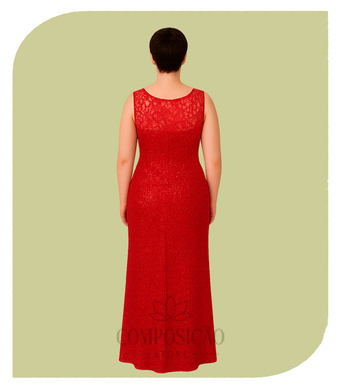 Decote Canoa com Transparência: O decote frontal é discreto e elegante, com a renda sobreposta ao busto.