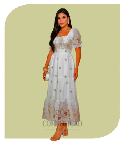 Vestido Longo Midi Bordado e Laise Plus Size – Puro Encanto (Cor Branco)